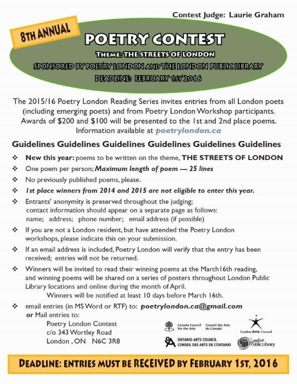 Watch for the winning poems to be displayed at branches of the London Public Library during Poetry Month, April 2016!